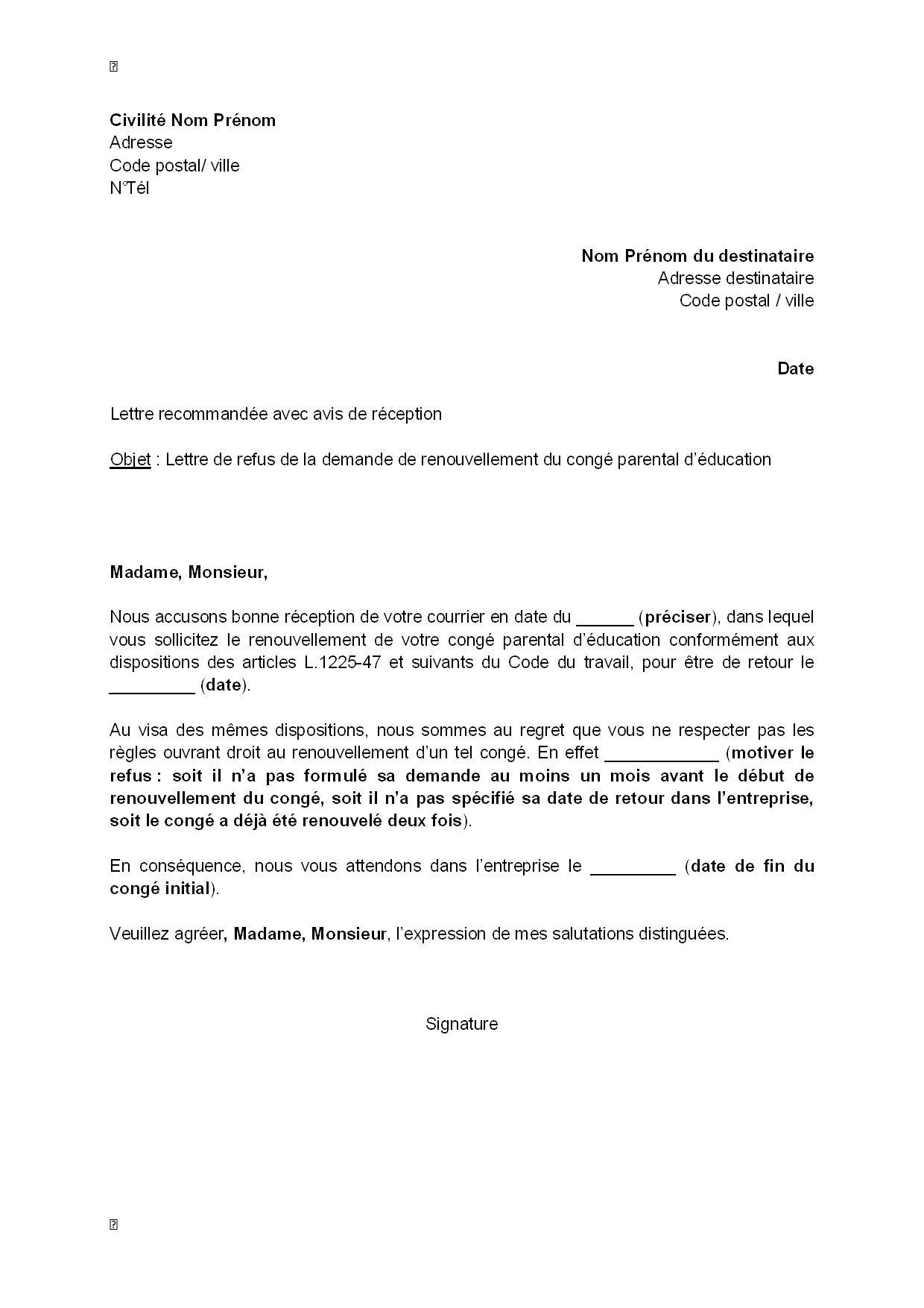 Demande de conges - modele-lettre-type.com.MODELE DE LETTRE DE CONGE PARENTAL D’EDUCATION Lettre a envoyer en recommande avec accuse de reception. Objet : Demande d’un conge parental d’education. Lettre de demande de conge parental . Tout salarie, homme ou femme, qui a un an. La demande doit etre faite a l.employeur par courrier recommande avec accuse de reception dans. lettre de demande de conge parental (les parties de. Cette categorie de conge parental afin de. Modele de lettre de reprise de travail apres un conge parental. Lettre fin de. Demande de conge parental d. Demande de conge parental total. temps a la lui consacrer en prenant un conge parental. Notre lettre: Ce courrier vous permet d’informer votre employeur de 5.15.2. Modele de lettre : reponse a une demande conge parental. 5.15.2. Modele de lettre. 3.9. Stages, teletravail,pret de main d.oeuvre, portage.